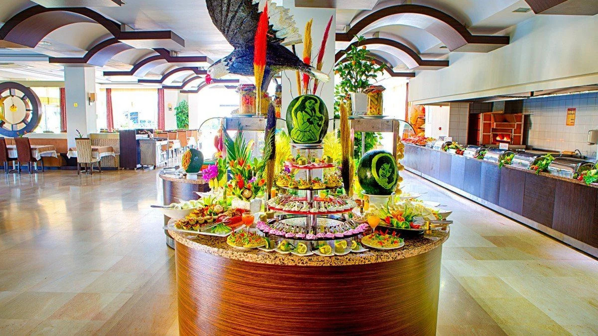 All inclusive zahrnuje snídaně (7:00-10:00), obědy (12:30-14:00) a večeře (19:00-21:00) formou bufetu, odpolední občerstvení, noční polévku nealkoholické a alkoholické nápoje místní výroby (10:00-24:00) v časech a místech určených hotelem.